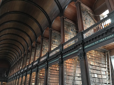 The tour then leads to the "Long Room" which houses the library's older books (as well as a display of the so-called Brian Boru harp). See picture above. They have a peculiar shelving system, based on a combination of date of acquisition and shelving books in decreasing size as you go up the cases. Which, I suppose, makes sense because I'd hate to be teetering on top of a tall ladder reaching over my head to lift down a folio-sized book.